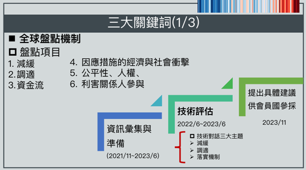 趙家緯總監說明全球盤點(Global Stocktake, GST)旨在評估全球實現《巴黎協定》目標的集體進展,此五年一期的盤點機制除了檢視氣候減緩及調適的進程、執行措施以外,也包含了各措施對經濟與社會帶來的影響、公平性,以及整體過程中的利害關係人參與。相關的資訊彙集與準備已在2021年開始,並於今年6月啟動技術評估,預計將在明年的COP28 之前產出成果報告,提供締約國具體建議以提升其氣候目標與行動。為了進一步強化氣候減緩的實踐,去年的COP26大會提出了「減緩工作計畫」(Mitigation Work Programme , MWP),將透過每年舉辦的部長級圓桌會議檢視「實踐鴻溝」,共同探索、討論可行的解決方案,並將其納入後續的國家自訂貢獻(National Determined Contribution, NDC)之中。細部的MWP運行機制將在本次峰會訂定。
