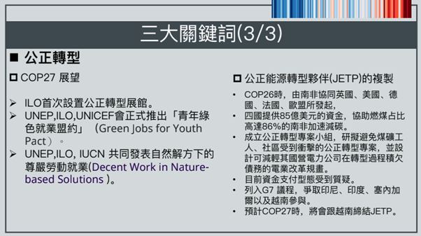 最後在公正轉型方面,今年的亮點在於:國際勞工組織首次在COP峰會上設立了公正轉型展覽館,並有專家常駐以利對該議題有興趣者前往交流、諮詢。不僅如此,國際勞工組織也與聯合國環境規劃署及相關單位共同提出了新的轉型論述方向,包含了青年綠色就業盟約(Green Jobs for Youth Pact)、以及以自然為本的解決方案下的尊嚴勞動就業(Decent Work in Nature- based Solutions)。在實務運作上,COP26時,南非協同英、美、德、法、歐盟,簽署了「公正能源轉型夥伴關係」(Just Energy Transition Partnership, JETP),這些先進國家除了提供資金(約85億美元)協助燃煤占比高達86%的南非加速減碳之外,也成立專案小組協助電力公司規劃電業改革,減少轉型過程中對煤礦工人與當地社區的衝擊。在南非執行後,G7也力促印尼、印度、塞內加爾等高燃煤占比的國家參與JETP,預計COP27時,越南將締結JETP。但近期也有媒體提出質疑:此85億美元其實是既有的援助資金轉換名目而已,又或是該資金僅僅只是借貸,而非無償支持。若其屬實,恐將對公正轉型這議題帶來負面效應。