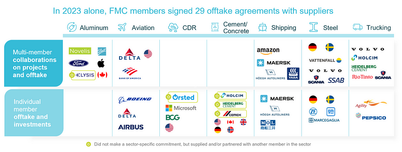 FMC的新進展則是成員數量上升至95家,總計做出了120項預購協議,橫跨鋼鐵、水泥/混凝土、鋁、航運、海運、貨運及碳移除等關鍵產業,預計在2030年進行價值高達150億美元的綠色採購,每年減少2900萬公噸二氧化碳當量(CO2e)。FMC訂定的產品低碳標準普遍不接受碳抵換(碳權)使用,且更強調供應鏈上下游企業的合作。