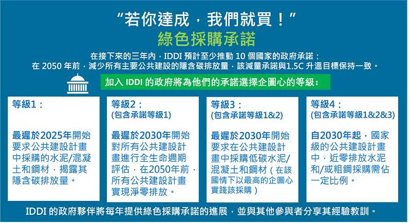 其中IDDI在今年有了新進展,加拿大、德國、英國和美國政府皆已把去年的口頭承諾轉化為法規政策或實際行動,且就四個等級的低碳採購時間表提供了明確的承諾規劃。