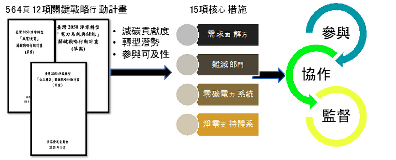 台灣於2022年3月公布2050淨零排放路徑與策略,12月28日時提出2030年減量目標以及12項關鍵戰略行動計畫,且於2023年中央政府總預算中,編列了660億元以上的相關預算,投入淨零轉型。