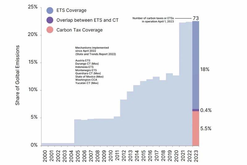 截至2023年4月止,全球共有73個施行中的碳價制度,約佔全球溫室氣體排放量的23%,多數受排放交易管制(18%),碳稅則含括了5.5%(圖A)。儘管於數量以及涵蓋溫室氣體程度上皆僅有微幅的成長(去年68個,佔22%),但報告中首先提醒,應考慮到過去受碳價管制的減量效益,亦即管制排放量體因碳價管制而減少,進也影響到整體佔比。