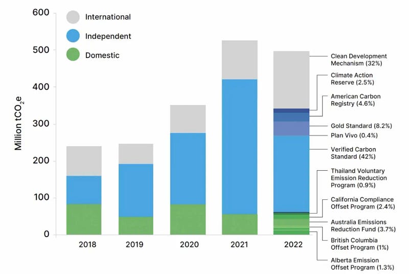 需求面主要仍來自企業自願減量或供應鏈上的要求,但企業為因應政府法定減量規範的法規遵行需求日漸增加,2022年約計有4,300萬噸的碳抵換,是用來抵減政府法定排放交易或者碳稅的減量責任。