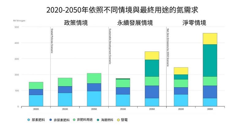 氨混燒發電是極大的資源浪費,該資源在其他非能源應用中才可能具有真正的減排效益。國際能源總署的報告指出,目前氨的用途主要為化肥以及工業應用,然而這些氨幾乎都是「灰氨」,因此用綠氨取代灰氨的需求就變得十分重要[4]。除此之外,綠氨也可以取代化石燃料,讓「難減排產業」(hard-to-abate industry),像是水泥、鋼鐵、塑膠等重工業得以順利脫碳,除此之外,氨也可以取代航運的傳統燃料。