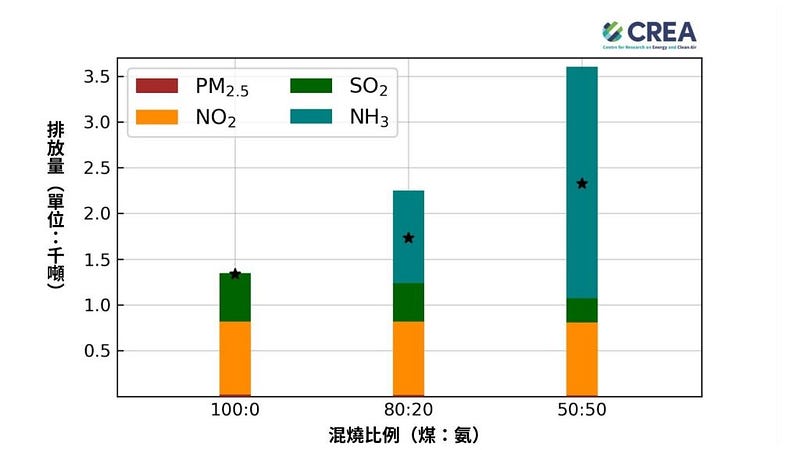 能源與潔淨空氣研究中心(Center for Research on Energy and Clean Air,CREA)針對日本火力發電廠不同的氨混燒情境進行分析,發現當氨在混燒中的比例越高,所產生的空氣污染物如:PM2.5、二氧化硫、二氧化氮排放量就越高,CREA近一步分析指出,當氨混燒比例達20%時,PM2.5等污染物質排放量會增加67%;混燒比例達50%時,則會增加167%的空氣污染物排放(圖三),這些污染物質可能來自氨的生產、運輸以及混燒的過程。CREA在最後呼籲由於氨混燒會造成大量的空氣污染,日本應儘速拋棄此策略並加速發展再生能源。