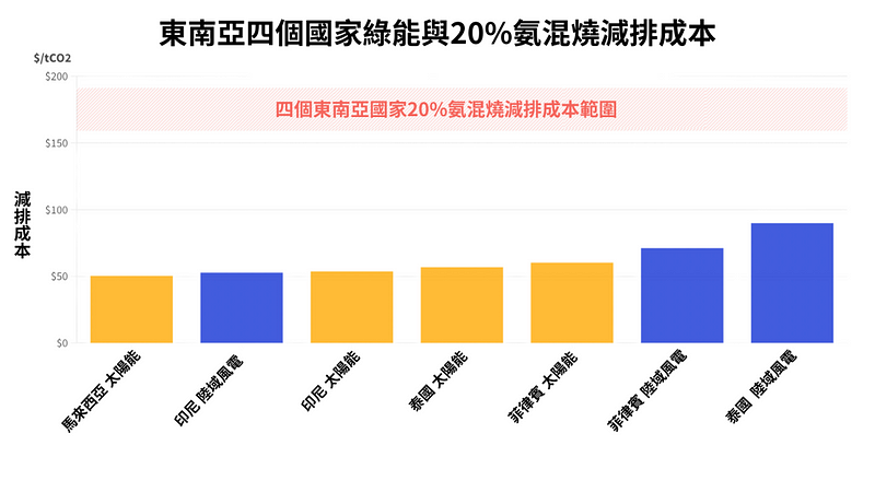 成本過高是氨混燒發電的另一個挑戰,與直接使用再生能源發電相比,這些微小的二氧化碳減排量的減排成本過高。在東南亞國家,20%混氨發電每減少一噸碳,就需要花159 美元至 191 美元,中位數為 175 美元。這比在這些國家的電網中使用太陽能或風能取代煤炭的成本高出四倍。(圖二)