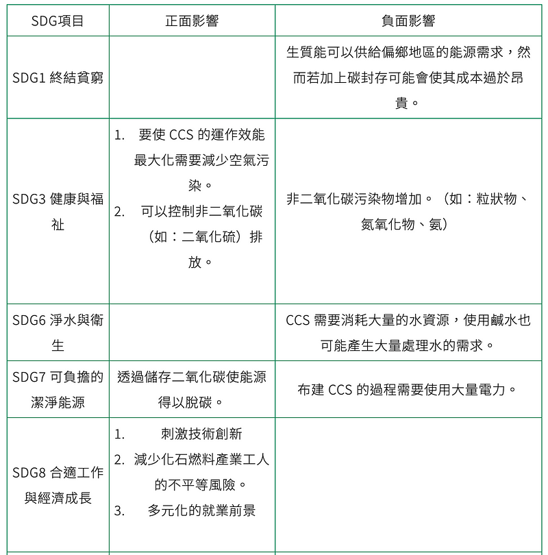除了以上四點之外,2022 年 IPCC 第六次評估報告中還提及: CCS 由於有冷卻需求,因此與原先的電廠相較,耗水量將增加 25% — 200%;因此,這項技術在水資源稀缺區域的發展前景相當有限。而美國環保署跟歐洲環境署的相關研究也指出,火力發電廠裝設 CCS 後,雖然可以減少溫室氣體排放量高達七成,但由於會導致能量轉換損耗,空氣污染物的排放量反而會增加。