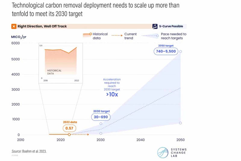 聯合國政府間氣候變遷專門委員會(IPCC)指出,除了立即且大幅度的將消減溫室氣體排放以外,要將升溫在盡可能不過衝(overshoot)的情況下控制在1.5°C以內,將需要一定程度的碳移除。這當中包括造林等自然措施和直接空氣捕捉(Direct Air Capture,DAC)等科技移除技術。在2030年以前,碳捕捉相關技術每年需要移除30至690百萬公噸的二氧化碳(MtCO2e),但2022年的總移除量還不及1百萬公噸;也就是說,科技碳移除需以較當前快10倍的速度擴張才能達標。