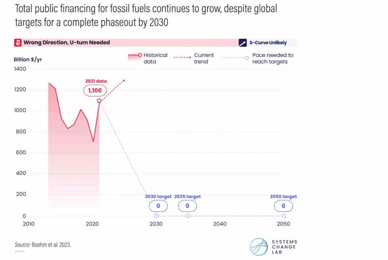 此外,若只是一昧的增加氣候金融的規模,但沒有同時自化石燃料開採與去森林化等高排放的經濟行為撤資,也無法達到要將升溫維持在1.5°C以內所需的減碳幅度與速度。然而在全球低碳能源供給方面的投資在2022年首度超越化石燃料,這個趨勢在2030年以前仍須加速超過10倍。