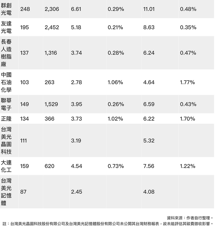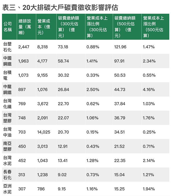 如表三所示,若以現在環境部的規劃,在扣除2.5萬噸的免徵額,並以碳費300元計算的前提下,前20大排碳大戶的碳費徵收僅會使其營業成本上漲0.15%-2.5%。若以碳費500元計算,影響幅度約0.25%-4.2%。總體而言,對於企業的影響幅度並不大。企業若以淨利進行評估碳費衝擊並不妥當,淨利的計算事實上受到多種因素的影響,並無法反映碳費的真實影響。