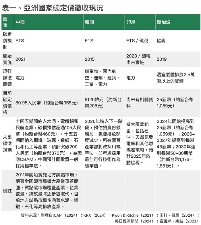 細觀台灣周遭鄰國已有不少國家實施或計畫要實施碳定價政策,現階段韓國、中國、印尼皆已實施排放交易體系(ETS),新加坡則收取碳稅。