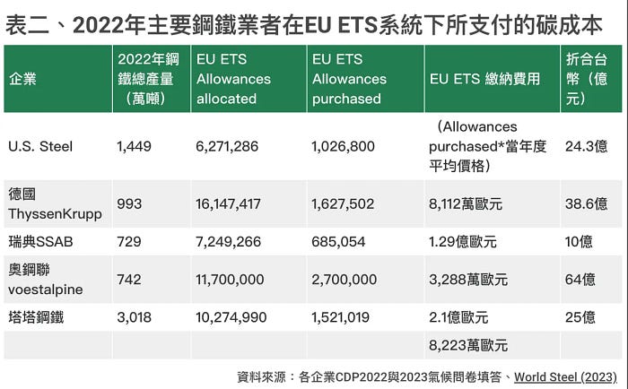 根據2022年及2023年有公開的企業CDP氣候問卷填答狀況(第11個題組:Carbon Pricing),可以得知業者取得的免費排放額度與購買排放額度數量,進而推算目前歐洲鋼鐵業者繳納的碳成本(表二),可發現各業者繳納的費用差距相當大,落在台幣10億至64億元不等。
