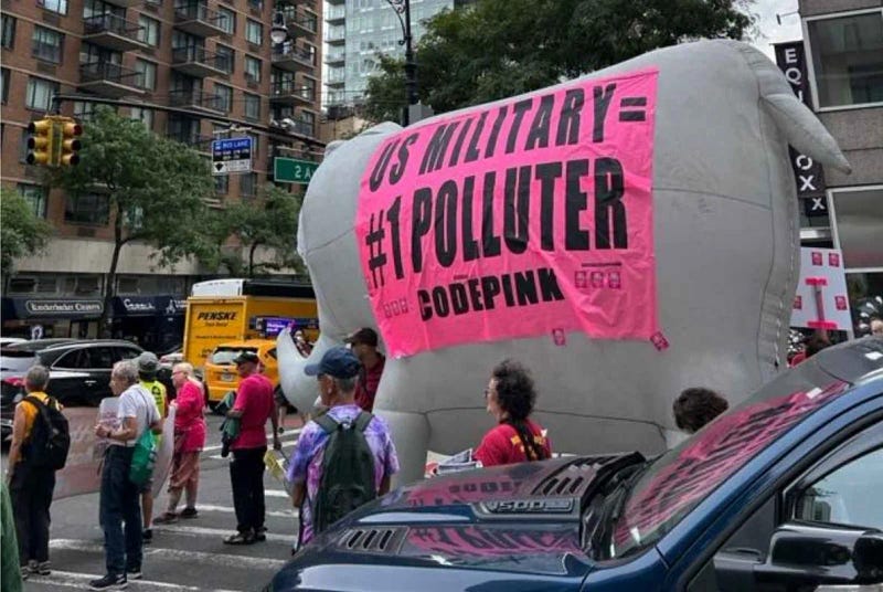 反戰女權團體CODEPINK的遊行道具,指出美國國軍的碳排放量為減碳行動中「房間裡的大象」。圖片來源/台灣氣候行動網絡研究中心提供