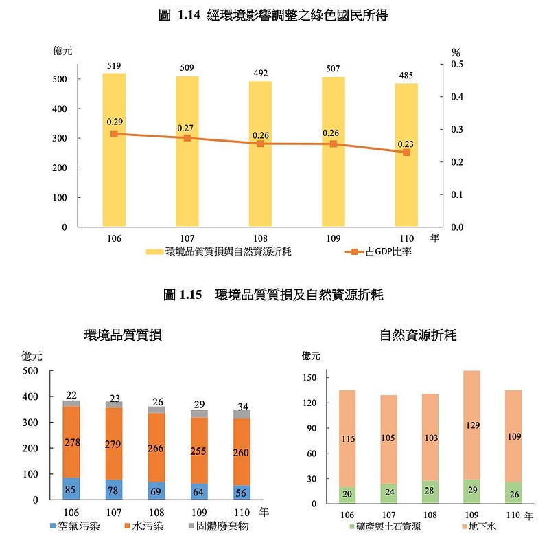 最新的綠色國民所得帳涵蓋時間範疇到2021年,GDP成長率破6%之時。因此經環境影響調整之綠色國民所得的影響從2017的0.29%降至0.23%。除了分母擴大外,分子也有降低,在地下水使用量降低下,整體質損及折耗值降至500億元以下。
