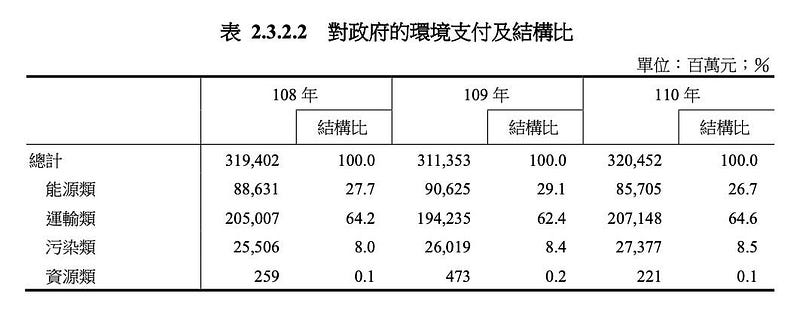 在環境保護支出上,可以從統計表(圖2)中看到公私部門溫室氣體減量的支出總計為37億元,雖然比過往增加,但這個數字還是低的荒謬。