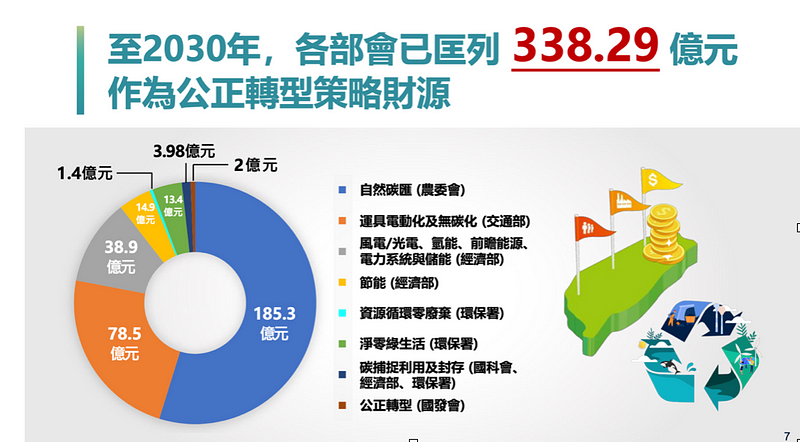 台灣這次公布的公正轉型戰略,雖提出未來至2030年時,各部會匡列338億元的預算投入公正轉型,但其中以碳匯佔比最高。