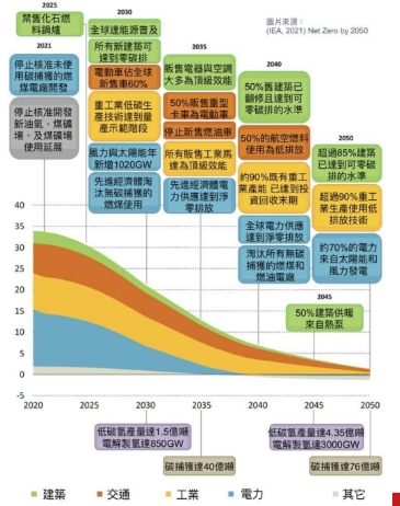 「2025年禁售化石燃料鍋爐、2030年新建築達成零碳排、2035年停止新售燃油車、2040年全球電力供應淨零排放、2050年70%電力來自光電與風電等。」