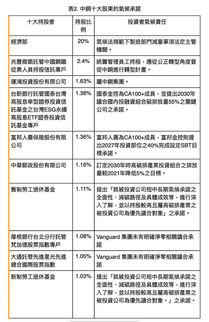 若就中鋼十大股東進行分析,則可見至少有國泰、富邦、中華郵政、勞退基金等五個股東,均針對投資對象的減碳作為提出確切議合的承諾。