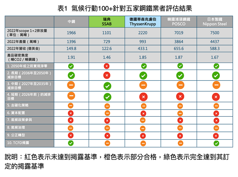 中鋼在短期(2026年以前)減排目標的揭露表現優於其他三家鋼鐵業者(德國Thyssenkrupp、日本製鐵Nippon Steel,及韓國浦項鋼鐵POSCO),在「中期(2027至2035年)減排目標」、「去碳化策略」與「氣候治理」等指標的資料揭露上則是與其他業者表現相當,皆為部分合格。