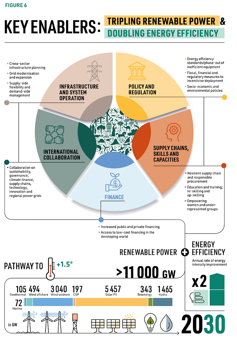 實現這些雄心勃勃的目標需要一套綜合的政策。除了部署和促進政策之外,還需要結構性變革,以確保向「高能源效率經濟和以再生能源為基礎的電力系統」的轉型是公平和公正的,並為所有人提供利益。