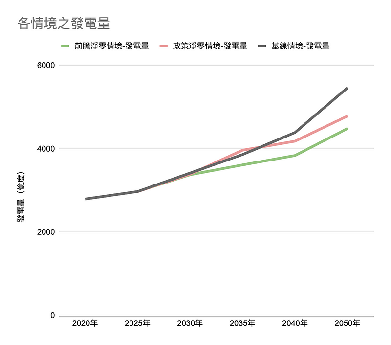 在此報告書中共模擬了三種不同的情境,分別是「基線情境」、「政策淨零情境」、「前瞻淨零情境」,這些情境分別採取了不同的政策、用電需求、技術投入等設定。