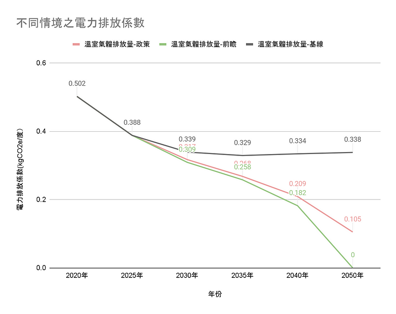 a.各情境下台灣2020年~2050年電力部門電力排放係數之變化