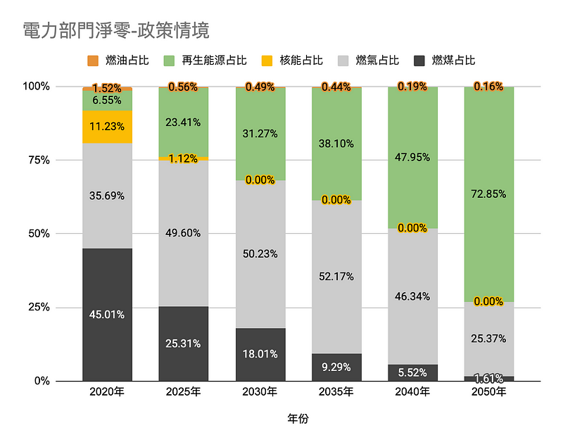 在政策情境中,2025年後核能除役而燃油小於 1%。再生能源自 2020 年 6.6%,至 2025 年為止增加至約 23.41%,爾後在滿足政策需求用電量並投入「臺灣 2050 淨零排放路徑及策略」中可利用之再生能源極限,至 2030年31.27%,2050 年占比約為 72.6%。此一占比,符合國發會「臺灣 2050 淨零排放路徑及策略」中再生能源約 (含氫能) 占去碳電力約七成之目標 (氫能約 9.2%)。