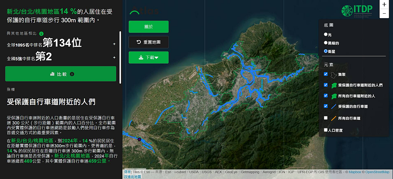 ITDP的永續城市交通地圖集是一個線上數據儀表板,展示全球約1,000個都市區域的九項永續和包容性城市客運指標。該地圖集利用開放數據,幫助政策制定者、倡議者、城市規劃者和公民了解基礎設施對人們的意義,特別在低收入和中等收入國家。網址:https://atlas.itdp.org/
