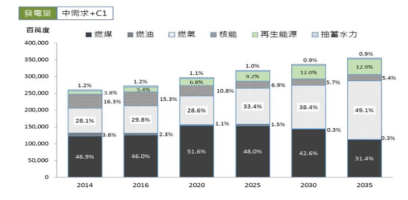 圖3,2020–2035年各階段發電結構(出自2015年能源政策環評的情境)