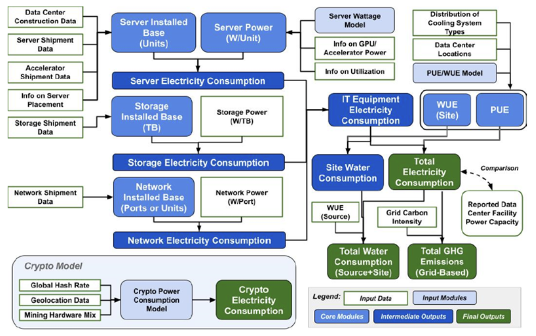 報告中分別就兩大耗能來源:「加速處理器(GPU)」(對應至伺服器)、「冷卻系統」(對應至資料中心空間配置)進行能耗拆解,根據不同伺服器類型、資料中心類型搭配伺服器生產量、資料中心數量(與在其中的伺服器數量)等建立推估模型,產生耗電量以及用水推估。(參考下圖分析的能耗流程)