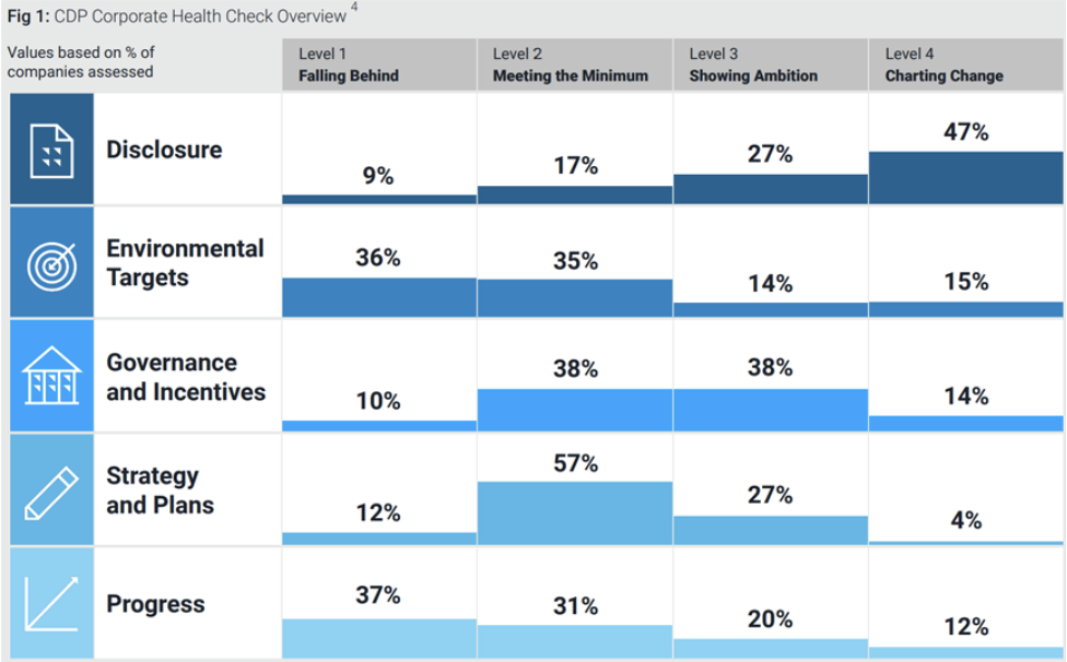 波茲坦氣候影響研究中心分享2024年地球健檢計畫(Planetary Health Check)揭露全球氣候相關風險的地理分布(如圖1),並提供資料供企業可以作為供應鏈氣候風險管理的來源。研究中心與CDP合作,藉由CDP的揭露評比,推動促進企業朝向「地球正向」(Earth-Positive Action)模式。於此構想之下,CDP於1月發布「2025企業健康檢查」(Corporate Health Check 2025)報告,當中設定五個指標:碳排放揭露、環境目標設定、企業管理、策略計畫、進展,當中可謂融合了CDP氣候、水、森林問卷等關鍵題目,為總共約6800家全球公司進行「地球正向」綜合評分。評分說明,目前約僅有20%的公司有達到CDP所設定的「地球正向」商業行為,其餘多數僅達到中等評級。(如圖2)