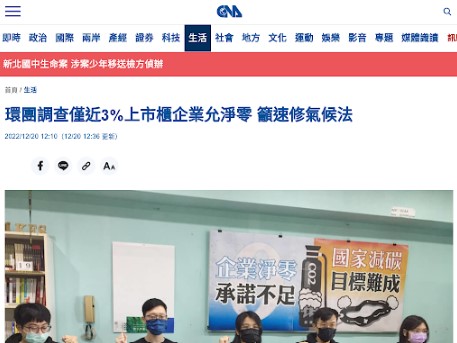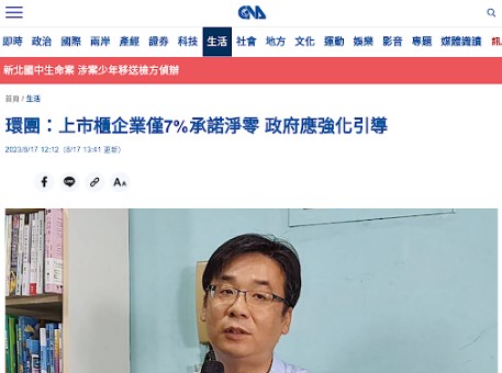 首度盤點上市櫃公司淨零承諾,僅3%達標。要求政府提高減碳目標,並加強制度誘因促使碳排大戶揭露減碳資訊、實現低碳轉型