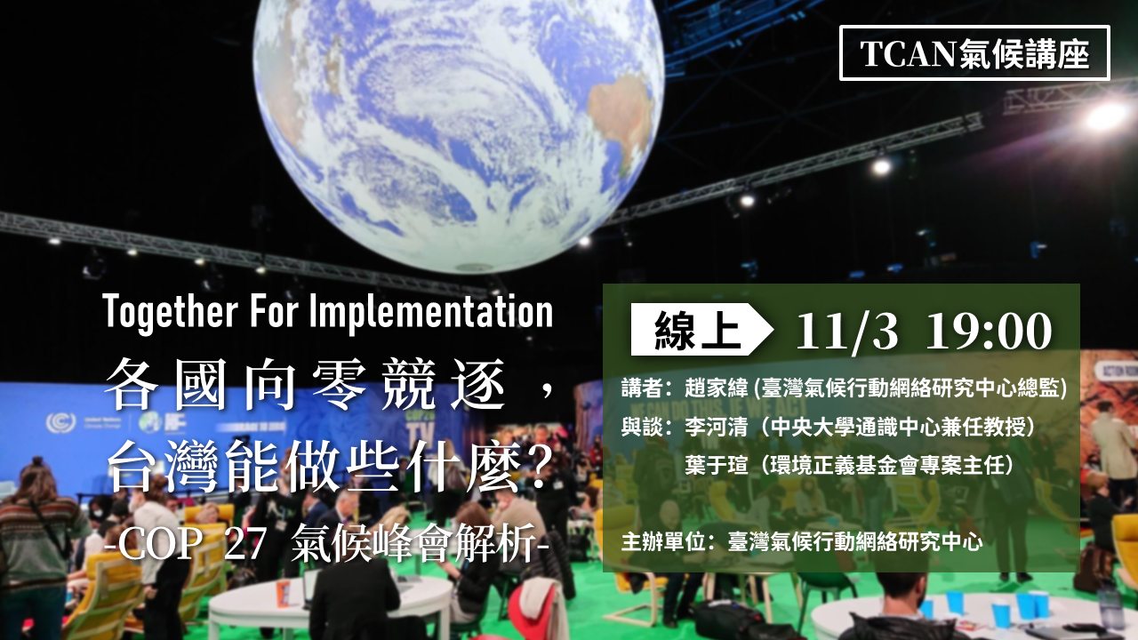 這場臺灣氣候行動網絡研究中心舉辦的「COP27的行前講座」,由臺灣氣候行動網絡研究中心趙家緯總監擔任主講人,亦邀請長期參與COP歷屆會議的中央大學通識中心李河清教授與 環境正義基金會葉于瑄專案主任擔任與談人。